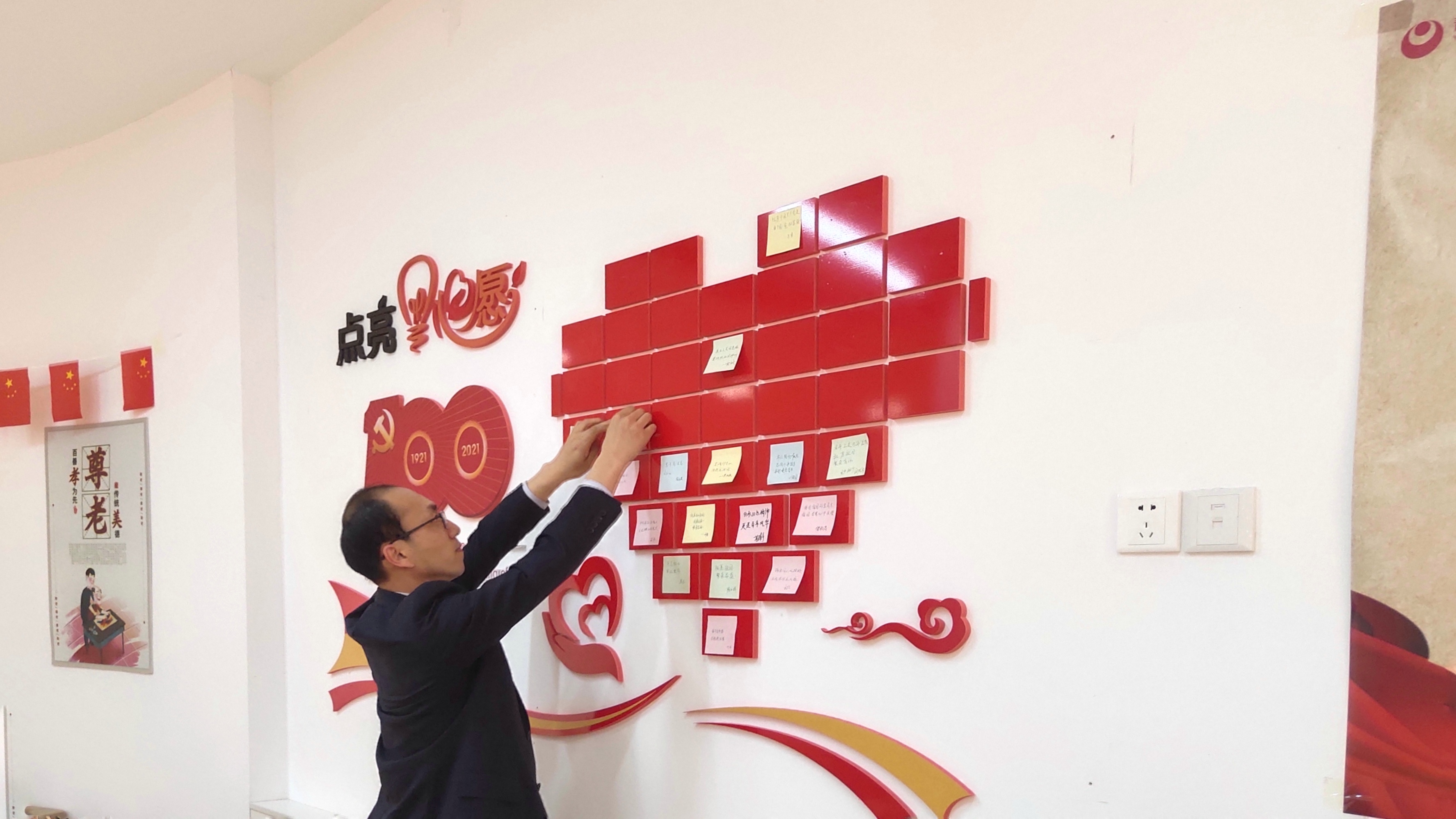 隨后,大家來到建黨百年心愿墻前,在心愿卡上一字一句地寫下對黨的祝福期盼和美好愿景,并親手貼上,表達(dá)對黨、對祖國的熱愛之情。