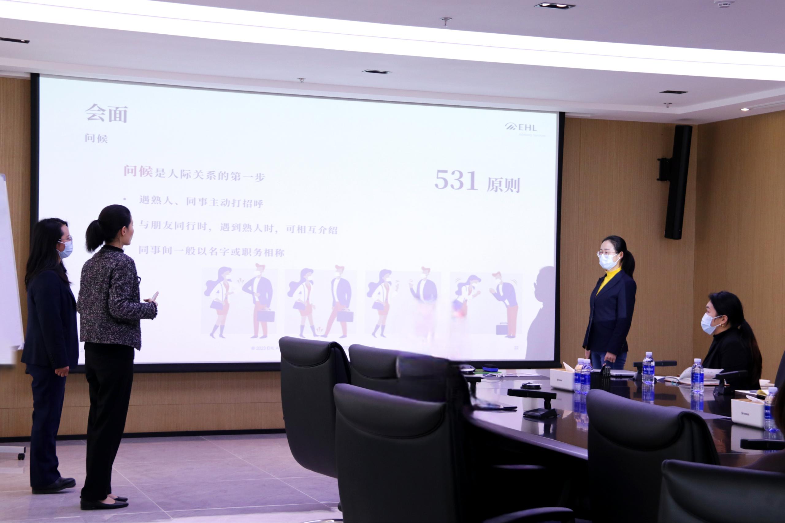 此次培訓(xùn)邀請了洛桑酒店管理學(xué)院集團(tuán)咨詢公司顧問呂堃講師、助理顧問謝一晗講師針對商務(wù)禮儀進(jìn)行授課。在培訓(xùn)中,兩位培訓(xùn)講師采取理論教學(xué)和現(xiàn)場互動實踐相結(jié)合的方式。一方面,通過援引事例生動闡釋商務(wù)禮儀的概念、作用、行為標(biāo)準(zhǔn)等理論知識;另一方面,通過場景模擬實踐、特定情境互動表演等環(huán)節(jié)詳細(xì)示范和訓(xùn)練禮儀規(guī)范。參訓(xùn)人員即學(xué)即練,在現(xiàn)場實踐互動中加深了對商務(wù)禮儀的理解和把握。