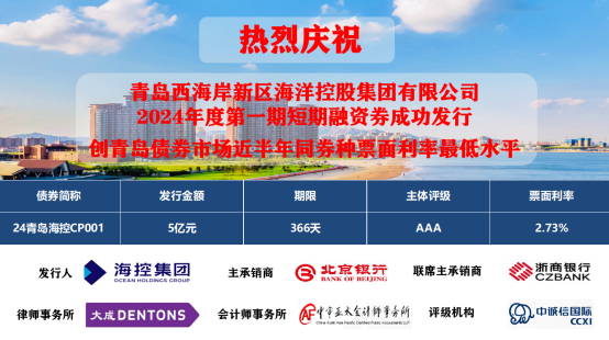 1月19日,海控集團(tuán)成功發(fā)行2024年度第一期短期融資券(24青島??谻P001),募集資金5億元,期限1年,發(fā)行利率為2.73%,認(rèn)購倍數(shù)5.72倍,創(chuàng)青島債券市場近半年同券種票面利率最低水平。