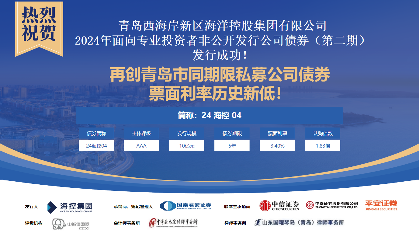 4月9日,??丶瘓F成功發(fā)行2024年面向專業(yè)投資者非公開發(fā)行公司債券(第二期),票面利率再創(chuàng)青島市同期限私募公司債券歷史新低。