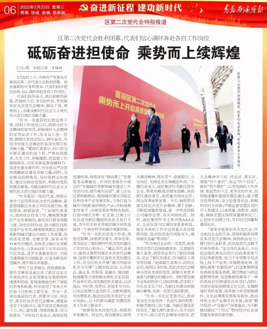 2月22日上午,中國(guó)共產(chǎn)黨青島市黃島區(qū)第二次代表大會(huì)勝利閉幕。肩負(fù)著新的任務(wù)和使命,代表們闊步走出會(huì)場(chǎng),信心滿懷奔赴各自工作崗位。